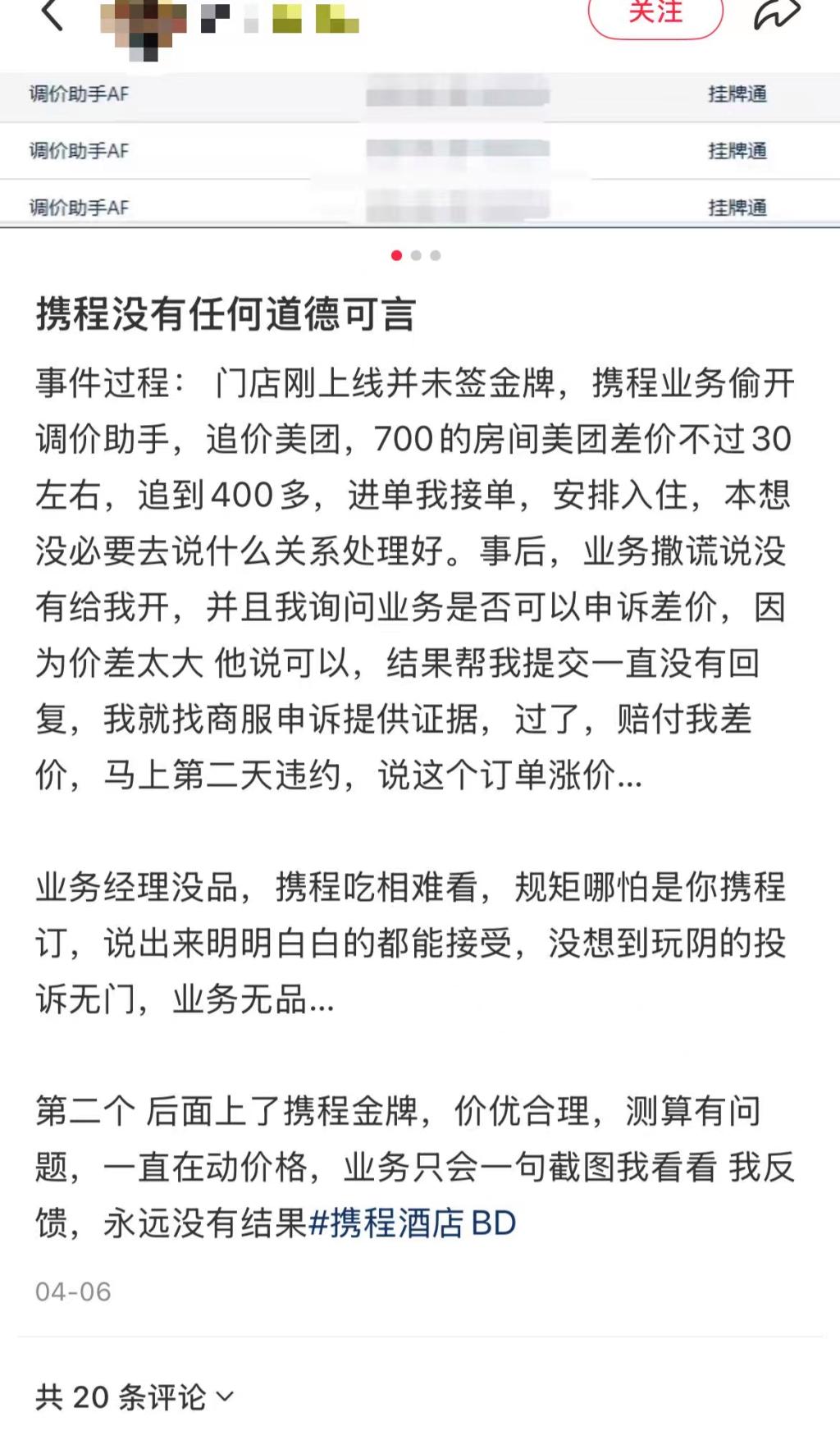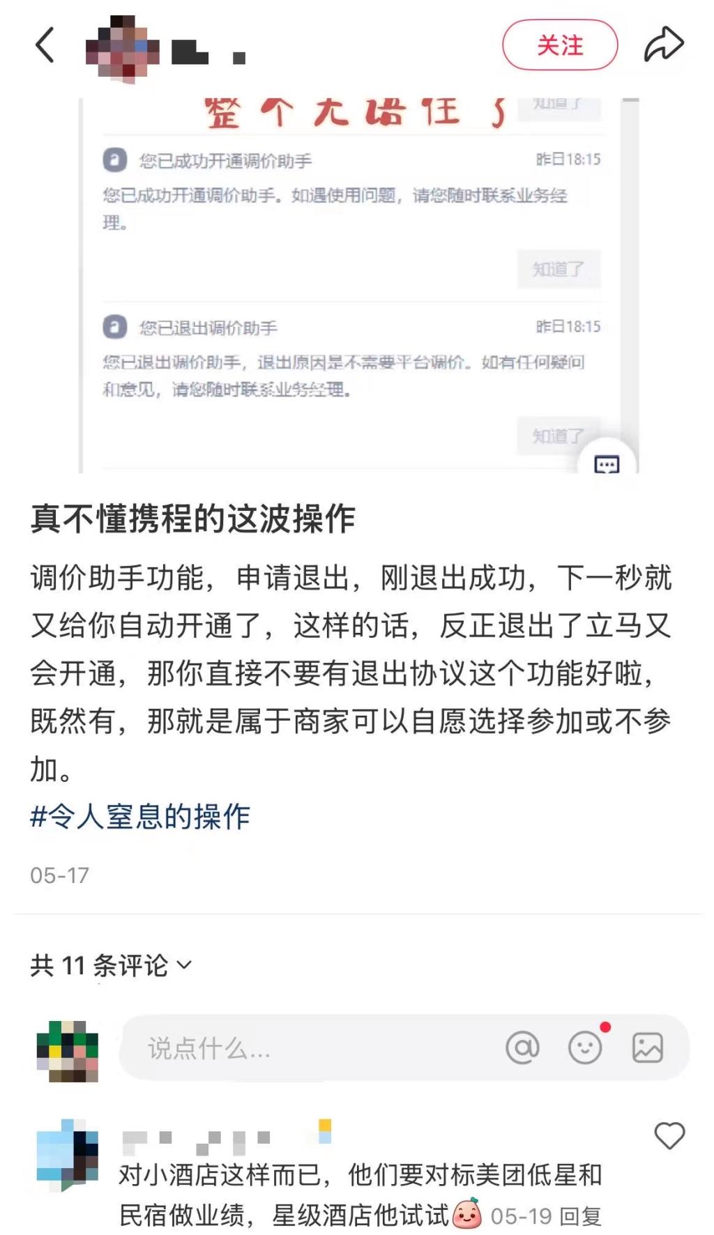记者注意到,不少商家通过某社交平台吐槽携程平台不正当竞争的乱象。有用户发布后台系统截图并表示,即便主动退出“调价助手”功能,平台仍会强制重启该服务;更有单体酒店经营者表示,携程业务人员未经授权擅自开通自动追价功能,将700元房型强行压价至400元接单。