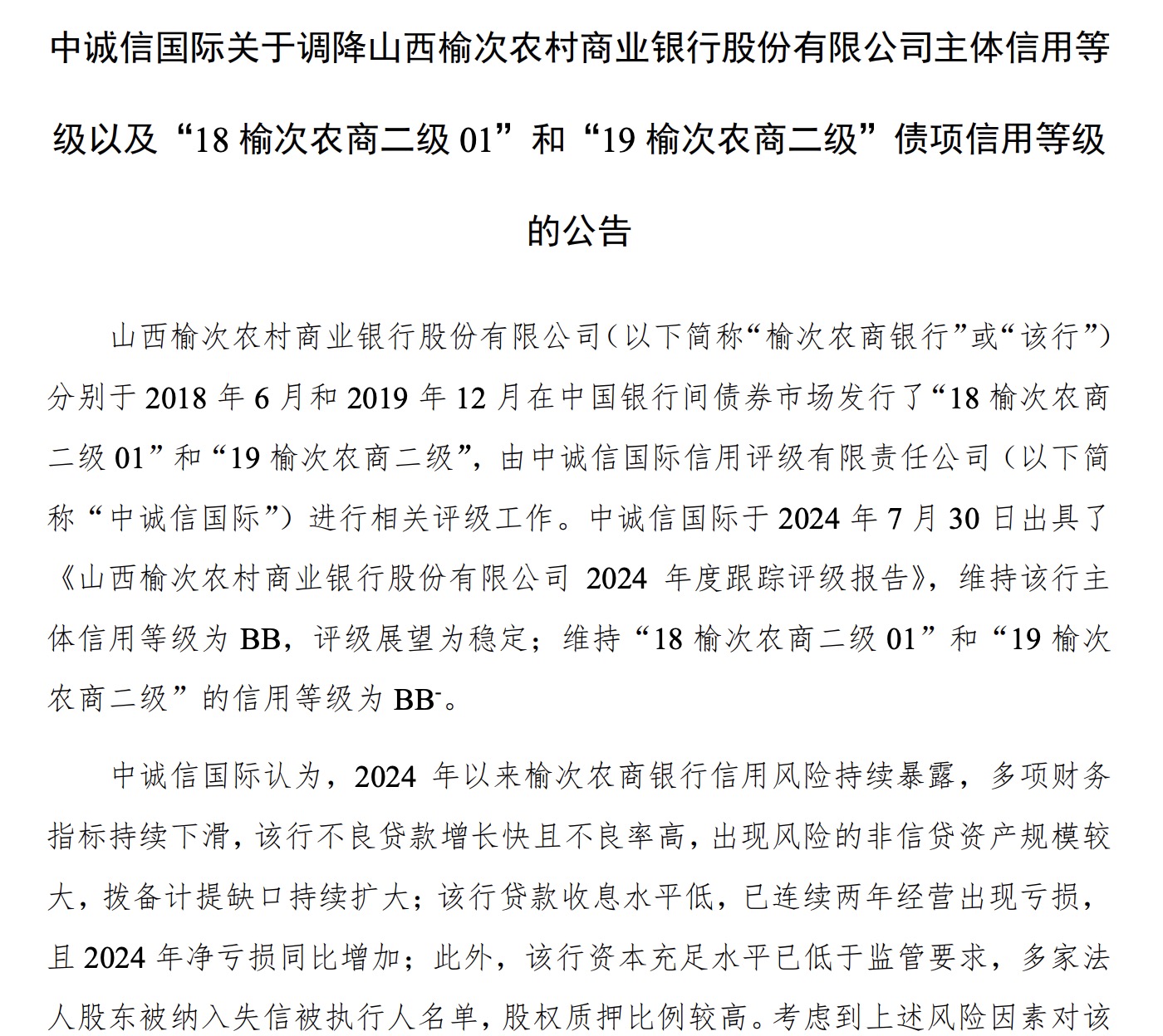 中诚信国际认为,2024 年以来榆次农商银行信用风险持续暴露,多项财务指标持续下滑,该行不良贷款增长快且不良率高,出现风险的非信贷资产规模较大,拨备计提缺口持续扩大;该行贷款收息水平低,已连续两年经营出现亏损, 且 2024 年净亏损同比增加。