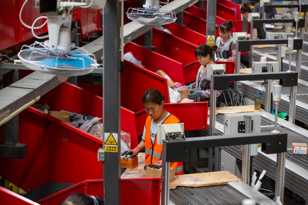 图为6月16日,在江苏省南通市通州区,工作人员在顺丰速递南通兴东转运中心的智能快递分拣流水线上作业。新华社发(翟慧勇摄)