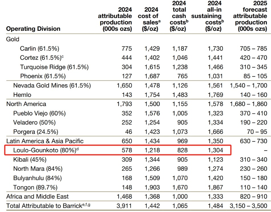 根据巴里克2024财年年报,位列全球十大金矿的卢洛-贡科托矿区去年产能达到72.3万盎司,按照股权比例(80%)计入57.8万盎司的产能。