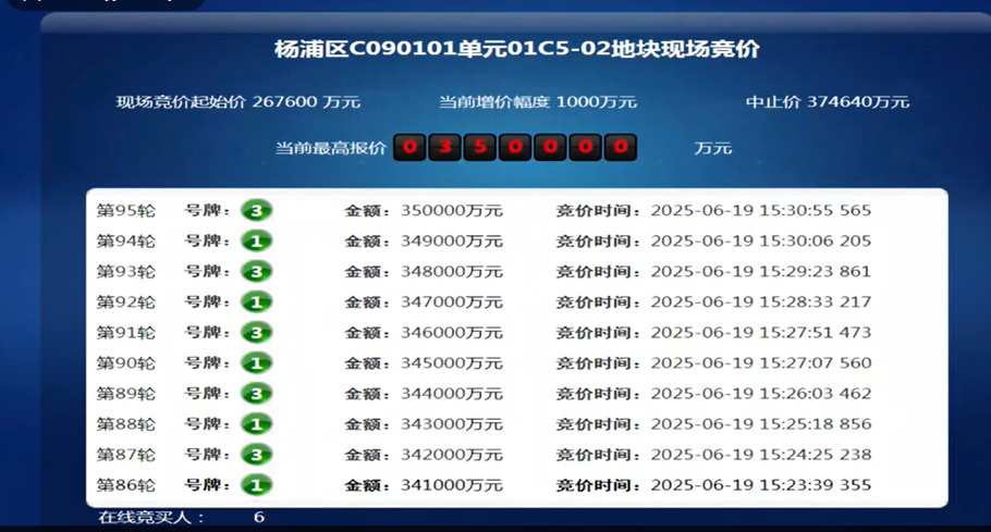 6月19日,上海第五批集中出让的五宗地块进入现场竞价环节。本次出让的唯一一宗位于内环内的为杨浦区C090101单元01C5-02地块。该地块吸引六位竞买人参与竞拍,经过95轮竞价,最终保利发展(600048.SH)旗下的上海保利城市发展有限公司以35亿元的总价竞得,未触及中止价,溢价率30.79%,成交楼板价95530元/平方米。