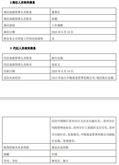 6月17日晚间,中银基金发布高管变更公告称,公司董事长章砚因工作调整于6月16日离任,且未转任公司其他工作岗位。在新任董事长履职前,暂由执行总裁张家文代行董事长职务,并代为履行法定代表人职责。