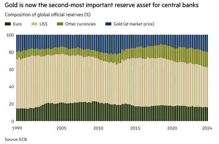 欧洲央行上周发布的一份报告,其实同样反映出了类似的格局变化。据欧洲央行称,受创纪录的购买量和金价飙升的推动,黄金已超越欧元,成为全球央行第二大储备资产——2024年黄金占全球官方储备的比例达到20%,超过了欧元的16%,仅次于美元的46%。
