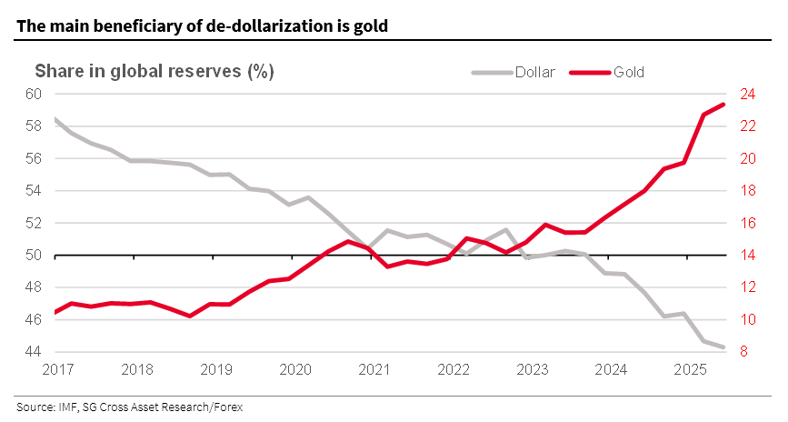 正如法国兴业银行图表所演示的,自2024年以来,去美元化进程并未如预期般使任何其他主要储备货币大为受益——在法定货币体系中,一种货币的损失本应会导致另一种货币获益。相反,黄金的份额在此期间则反而明显增加。