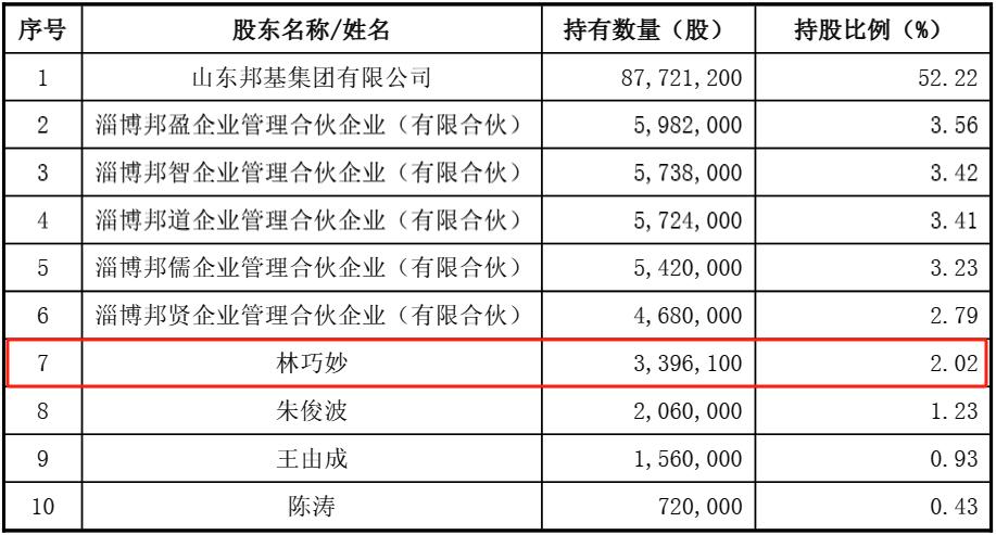 界面新闻对比一季度末和6月4日邦基科技十大股东名单可知,自然人林巧妙以339.61万股新增成为公司第7大股东,占总股本比例2.02%,占流通股本4.20%。以最新收盘价计算,持仓市值7,033.32万元。