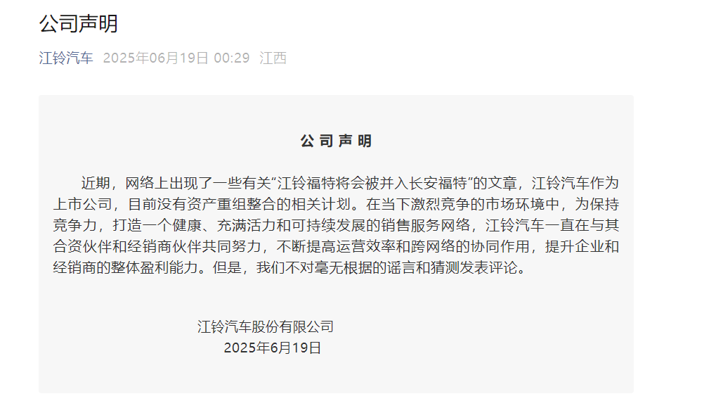 江铃汽车6月19日发布声明称,近期,网络上出现了一些有关“江铃福特将会被并入长安福特”的文章,江铃汽车作为上市公司,目前没有资产重组整合的相关计划。