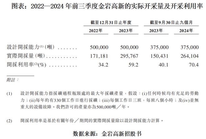 招股书还显示,朔里高岭土矿场的许可生产规模和设计开采能力均是年产50万吨矿石,而2022—2024年前三季度,金岩高新实际开采量分别仅为17.12万吨、29.58万吨、26.41万吨,开采利用率分别仅为34.2%、59.2%、70.4%。