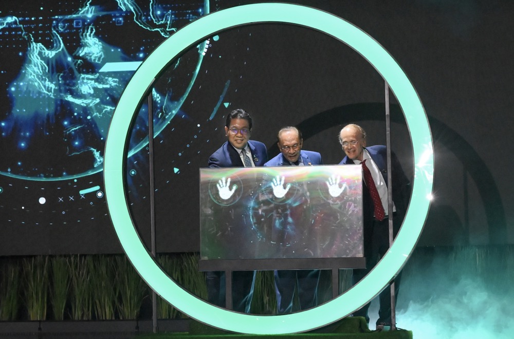 马来西亚首相拿督斯里安瓦尔(中)、马石油总裁兼集团首席执行官、亚洲能源论坛主席丹斯里陶菲克(左),与标普全球副董事长暨剑桥能源周创始人丹尼尔·耶金博士(右)出席2025亚洲能源论坛(Energy Asia 2025)开幕仪式。