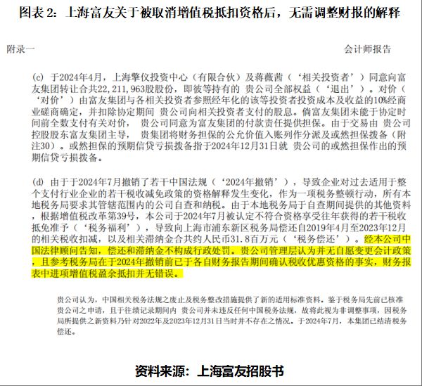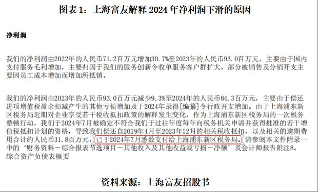 根据招股书,2024年7月,上海浦东新区税务局开展了税务整顿行动,因该局对企业享受若干税收抵扣政策的解释发生调整,经核查发现,上海富友过往年度(2019年4月—2023年12月)每年向税务机关申请并获得批准的若干增值税抵扣计划资格,不再符合调整后的政策执行标准。因此,上海富友需偿还上述期间的相关税收抵扣及对应的逾期费用,合计3180万元。