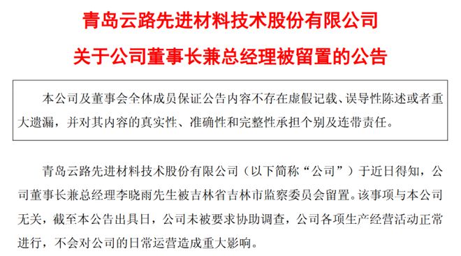 6月16日晚间,云路股份(688190.SH)公告称,公司于近日得知,董事长兼总经理李晓雨被吉林省吉林市监察委员会留置。