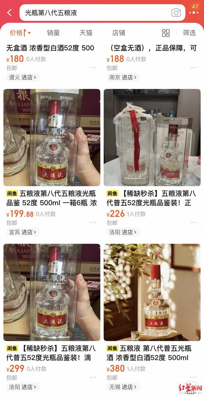记者搜索电商平台发现,“光瓶第八代五粮液”按价格升序,靠前产品多为二手平台交易,价格显示为200元/瓶至650元/瓶不等。记者询问其中多位商家,对方直接表示,该价格的产品为“高仿”“精仿”,并非正品酒。