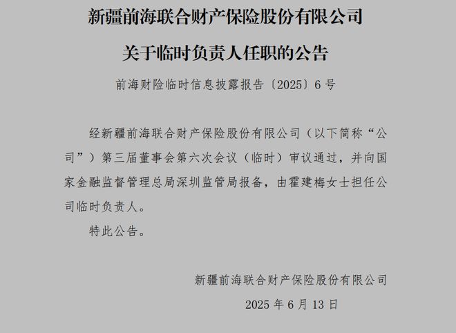 总经理职务方面,记者关注到,6月13日,前海联合财险同步公告称,李功霓因个人原因辞去公司总经理职务,不再担任公司及下属机构任何职务;经董事会审议通过,并向深圳金融监管局报备,霍建梅出任公司临时负责人。