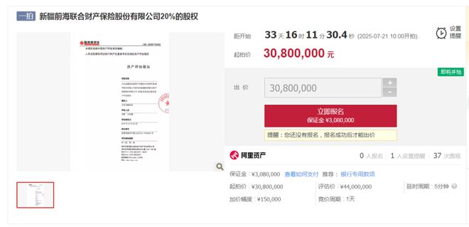 在阿里司法拍卖平台,新疆前海联合财产保险有限公司(下称“前海联合财险”)20%股权将于7月21日正式拍卖。该笔股权由宝能集团旗下深圳市钜盛华股份有限公司(下称“钜盛华”)持有,评估价4400万元,起拍价3080万元,折价三成。