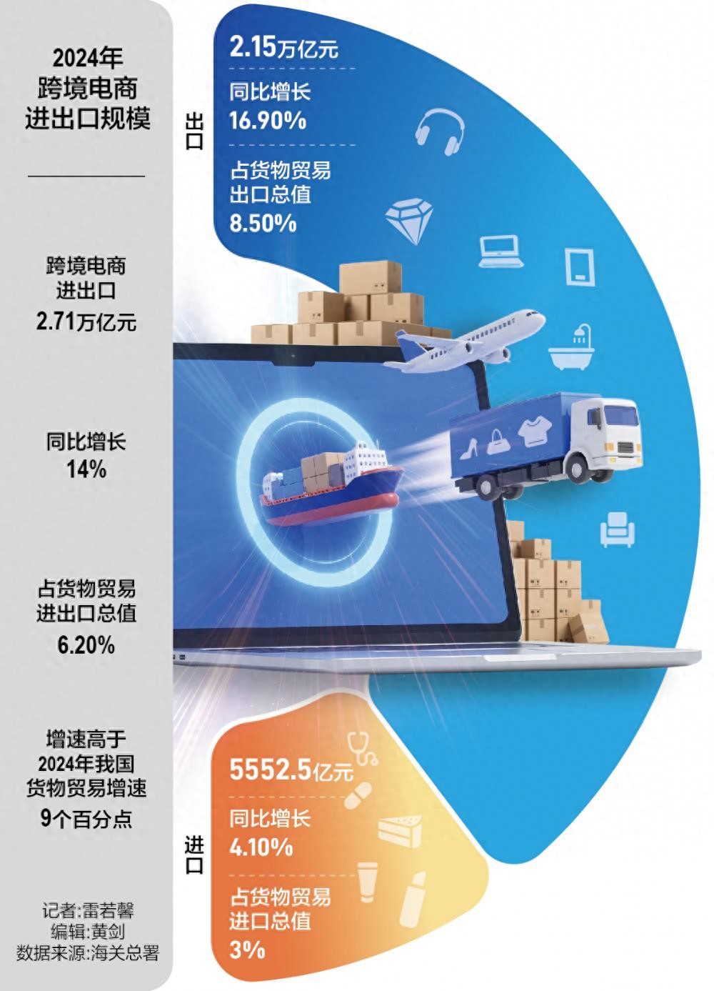 据央视新闻报道,海关总署数据显示,2024年我国跨境电商进出口规模达到约2.71万亿元,同比增长14%,占我国货物贸易进出口总值的6.2%。值得注意的是,这一增速比同年我国货物贸易增速高了9个百分点。