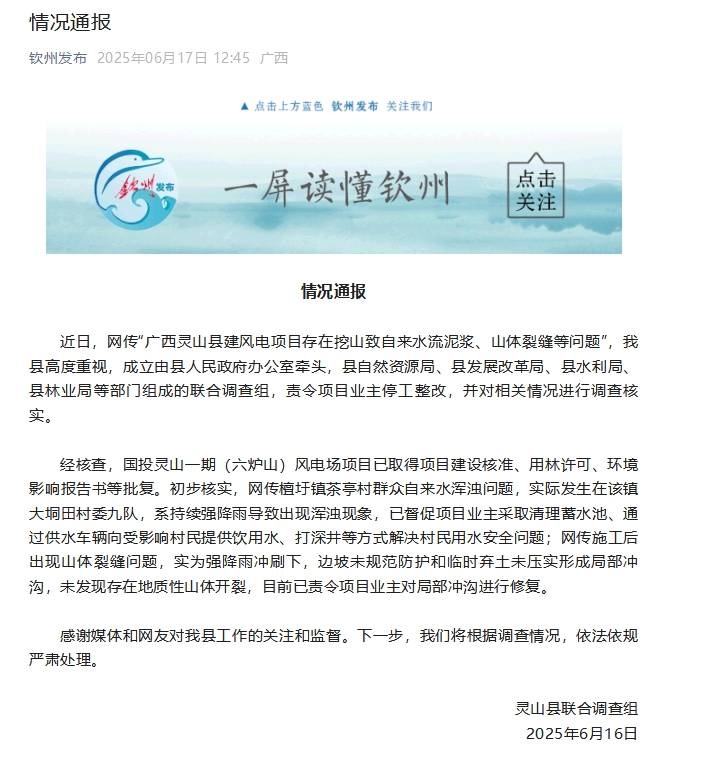 据“钦州发布”微信公众号消息,广西省钦州市灵山县联合调查组16日发布情况通报称,近日,网传“广西灵山县建风电项目存在挖山致自来水流泥浆、山体裂缝等问题”,灵山县高度重视,成立由县人民政府办公室牵头,县自然资源局、县发展改革局、县水利局、县林业局等部门组成的联合调查组,责令项目业主停工整改,并对相关情况进行调查核实。
