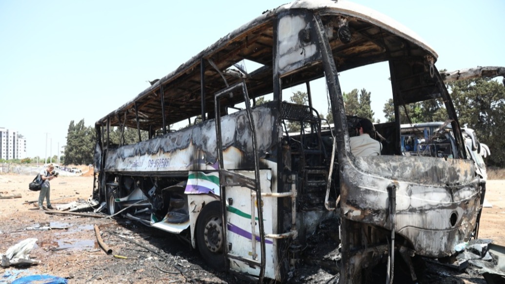 6月17日,在以色列中部城市海尔兹利亚,一辆巴士在导弹袭击中损毁。新华社 图