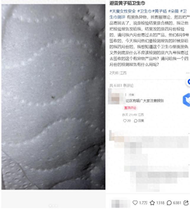 6月中旬,一名消费者发帖称,使用歌手黄子韬创办的“朵薇”品牌卫生巾时发现黑色异物,联系客服后,被告知检验结果为合格,该消费者已将产品寄回。该消费者称,“朵薇”方发的是4月份的检验报告,其想知道这个黑色异物是什么。帖文中相关图片显示,近距离拍摄下,能看到卫生巾表面有两处细小的黑点。