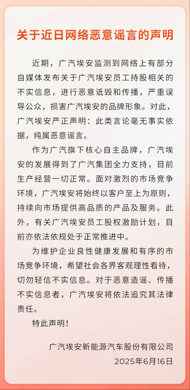 近期,广汽埃安员工持股计划引发市场关注,部分自媒体报道称员工因股权估值缩水面临巨额亏损,甚至出现集体拒付利息、准备劳动仲裁的情况。对此,6月16日晚,广汽埃安发布《关于近日网络恶意谣言的声明》,对网传员工持股相关消息正式回应称,此类言论毫无事实依据,纯属恶意谣言,有关广汽埃安员工股权激励计划,目前亦依法依规处于正常推进中。