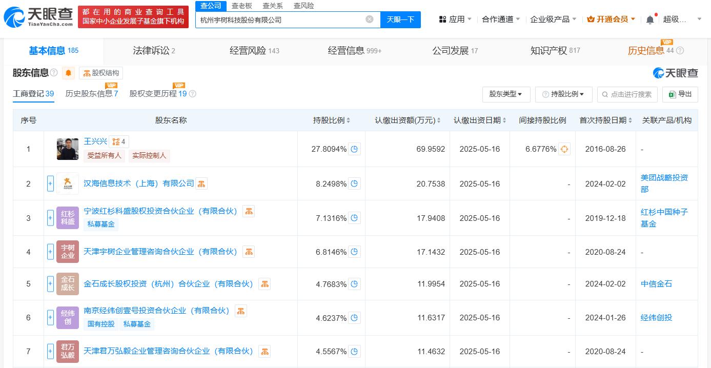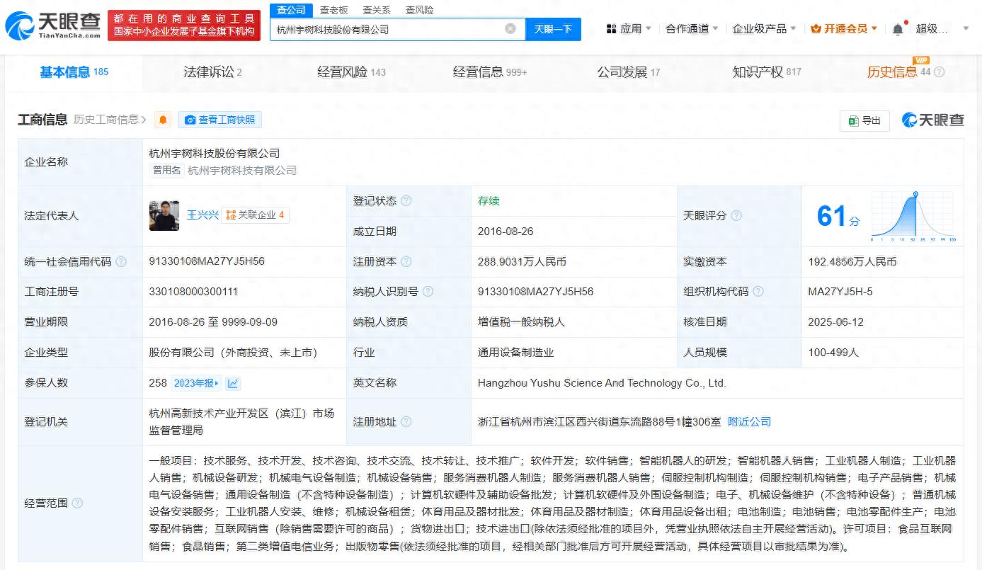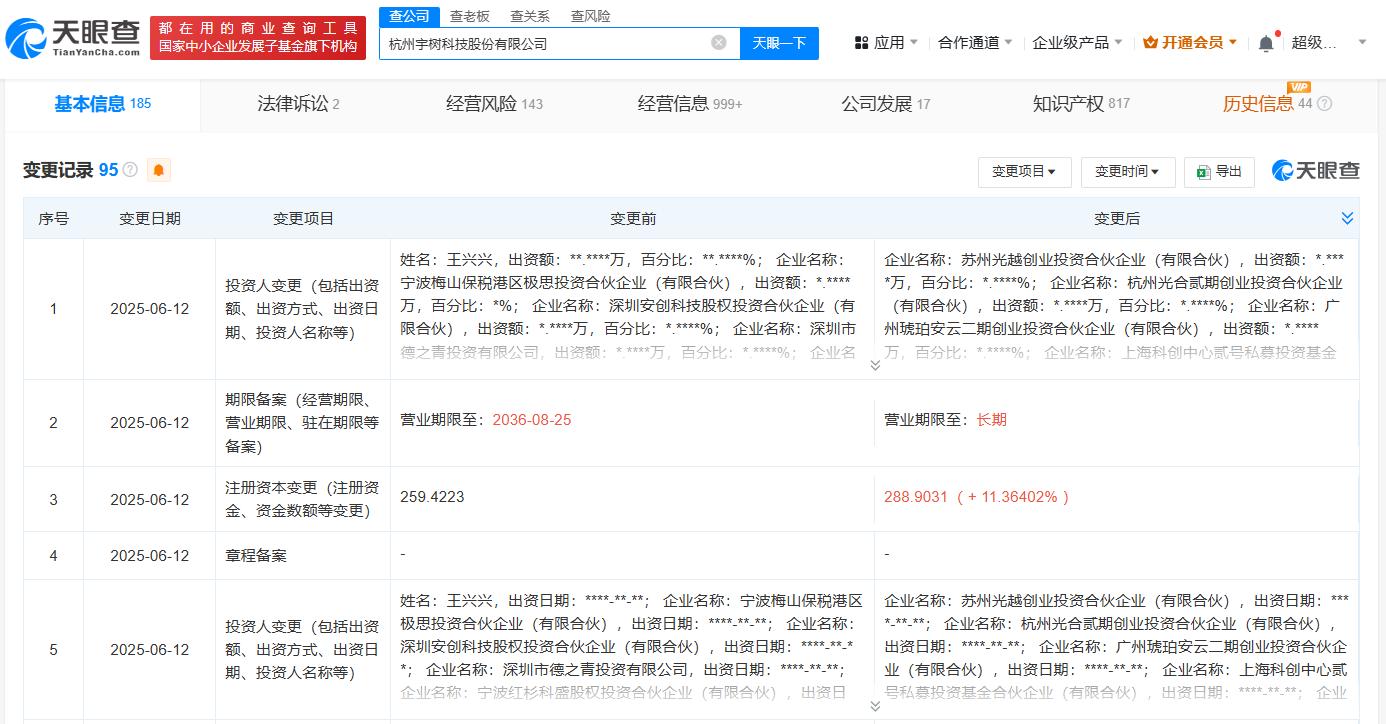 天眼查App显示,近日,杭州宇树科技股份有限公司发生工商变更,注册资本由约259.4万元人民币增至约288.9万元人民币,增幅约11%。该公司成立于2016年8月,法定代表人为王兴兴,经营范围包括智能机器人的研发、智能机器人销售、工业机器人制造等,由王兴兴、汉海信息技术(上海)有限公司、宁波红杉科盛股权投资合伙企业(有限合伙)等共同持股。