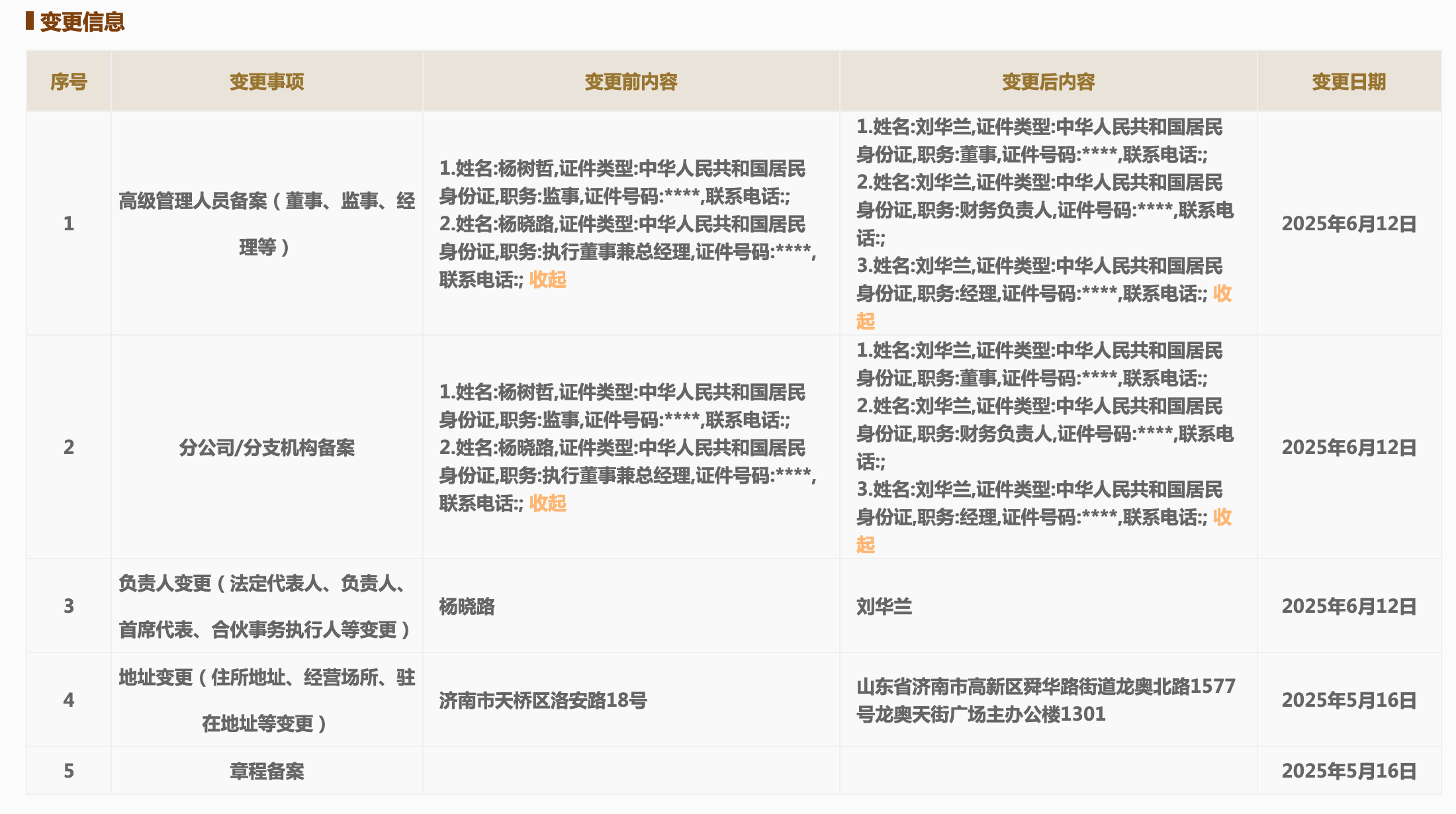 国家企业信用信息公示系统网站显示,近日,济南杨铭宇餐饮管理有限公司发生工商变更,杨晓路卸任法定代表人、执行董事兼总经理,刘华兰接任法定代表人,并担任董事、经理、财务负责人职位。