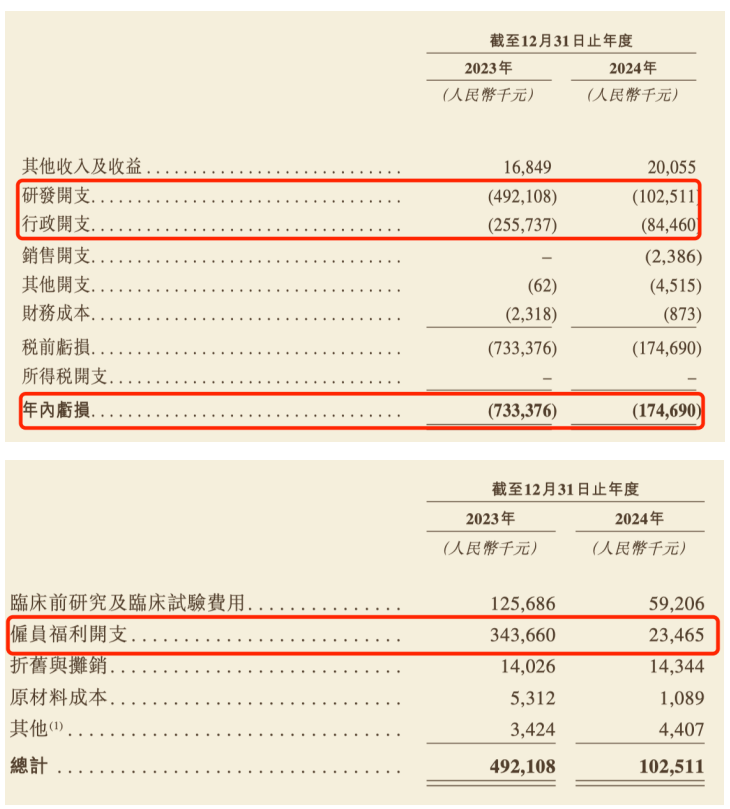 需要关注的是,从研发投入的构成变化来看,这笔费用的缩减主因是雇员福利开支锐减,该项费用由2023年的3.44亿元大幅下滑93.17%至2024年的2346.5万元;其次是临床前研究及临床试验费用由2023年的1.26亿元腰斩52.89%至5920.6万元。与此同时,行政开支的大幅收缩是公司2024年亏损收窄的另一关键因素。该项费用从2023年的2.56亿元降至2024年的8446万元,其中公司雇员福利开支从2023年的2.39亿元下滑81.57%至4401.3万元。