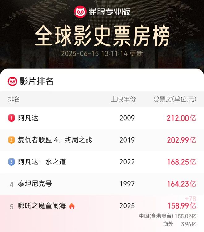 根据猫眼专业版数据,《哪吒2》目前总票房约为158.99亿元,其中,海外票房3.96亿元。在全球影史票房榜上,《哪吒2》位居第五。