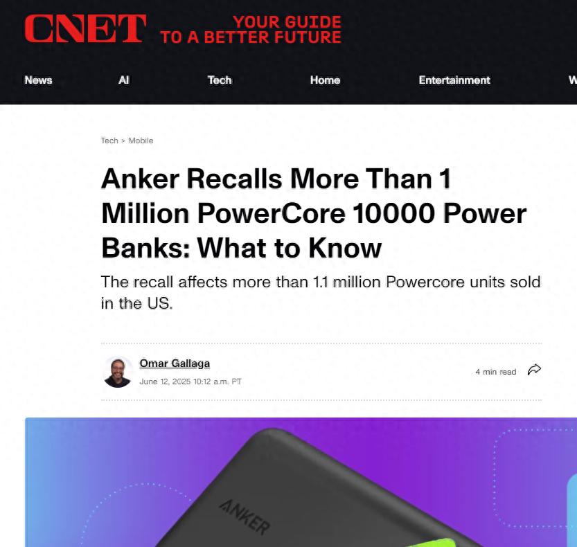 6月13日,据外媒报道,电子产品制造商安克宣布召回超过110万台PowerCore 10000移动电源,原因是该公司收到了19起关于该产品发生火灾和爆炸的报告。此次召回涉及2016年6月1日至2022年12月31日期间购买的A1263型号产品。