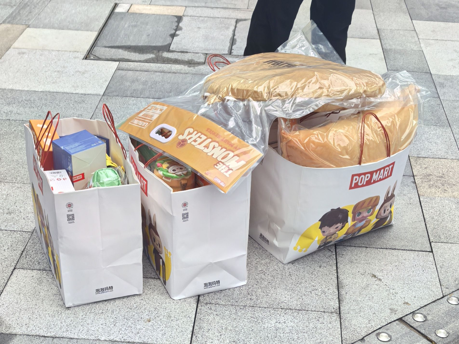 在快闪店马路对面,一名疑似“黄牛”正在打包他所收购的三大袋“战利品”。当现场有消费者问他是否销售时,他小心翼翼地说,“想要可以加我微信,今天现场抓得太严了,具体我们在线谈,今天早上我看到有不少同行已经被警察带走了。”