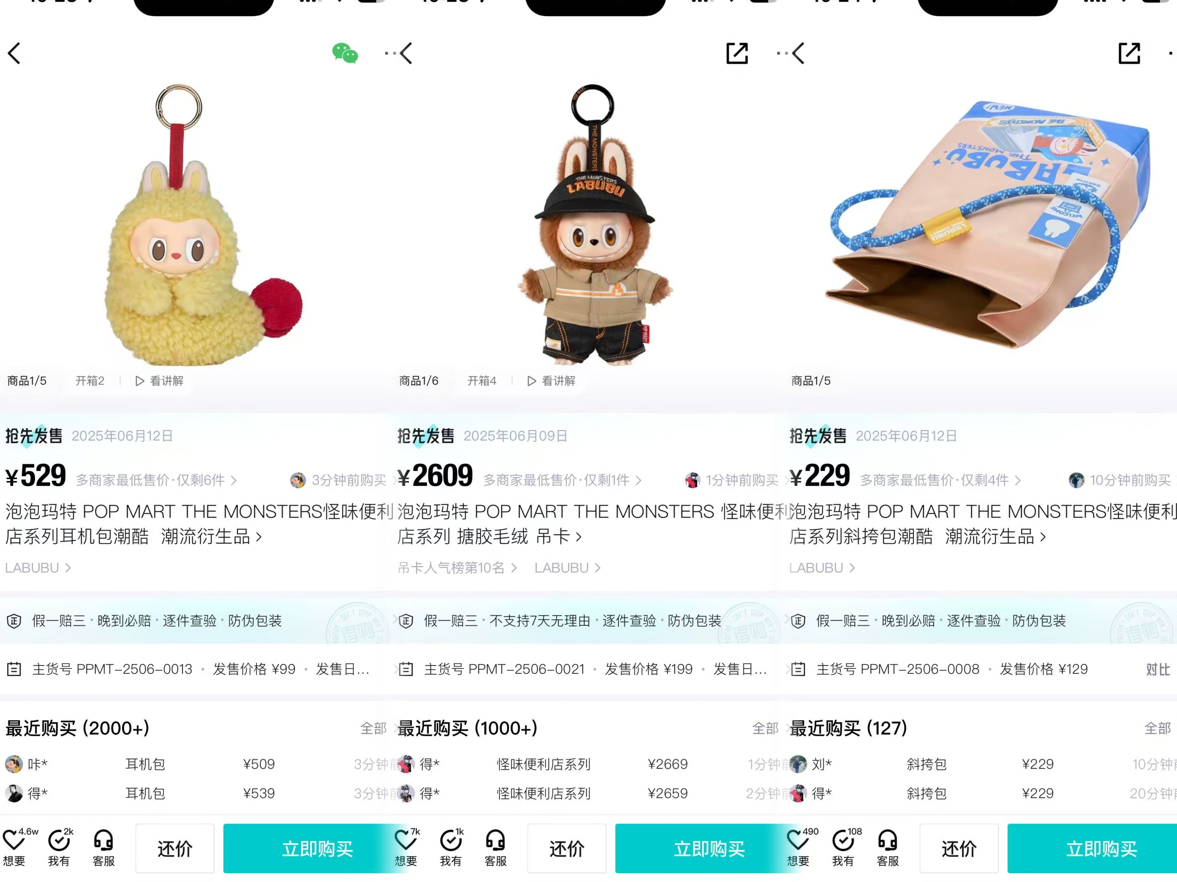 记者注意到,6月12日、13日10点开放的次日时段的预约进店名额仅几秒钟内便“秒空”。预约名额一抢而空,而“黄牛”也没有闲着,快闪店商品价格在59至299元不等。搪胶毛绒吊卡、三明治小包、挂式纸巾抽等新品,在某二手社交平台上最贵的已经被炒到2600元以上。