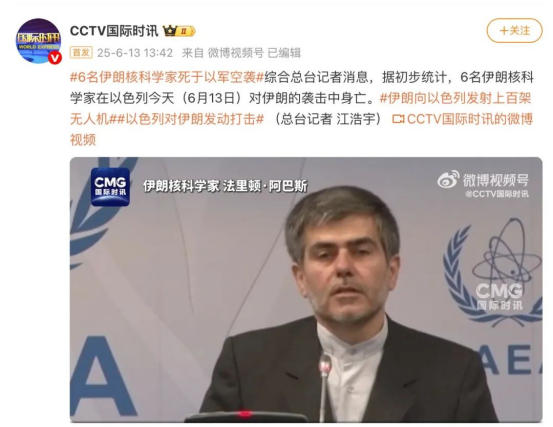 综合总台记者消息,据初步统计,6名伊朗核科学家在以色列今天(6月13日)对伊朗的袭击中身亡。