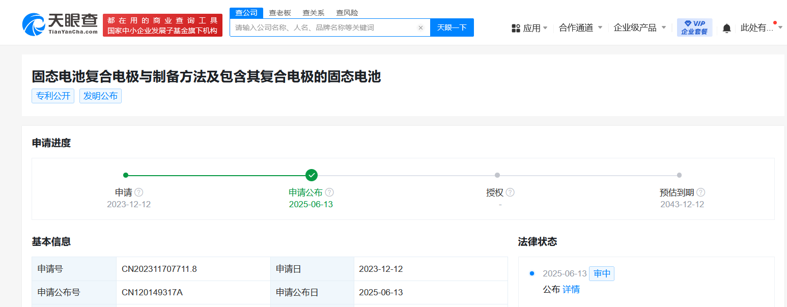 天眼查知识产权信息显示,近日,小米汽车科技有限公司申请的“固态电池复合电极与制备方法及包含其复合电极的固态电池”专利公布。摘要显示,该专利公开的固态电池复合电极有效缩短了金属离子在厚电极中的传输路径,加快了金属离子在电极之间的传输速率,具有较高的电极载量和倍率性能。