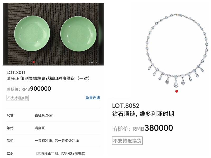 在本次拍卖策展人早早的社交媒体评论区,有人称赞这是“足以载入史册的拍卖”。同场拍卖中,一条19世纪维多利亚时期的钻石项链以38万落槌,一对清雍正御制果绿釉暗花福山寿海图盘的落槌价为90万——均不敌年纪轻轻的Labubu。