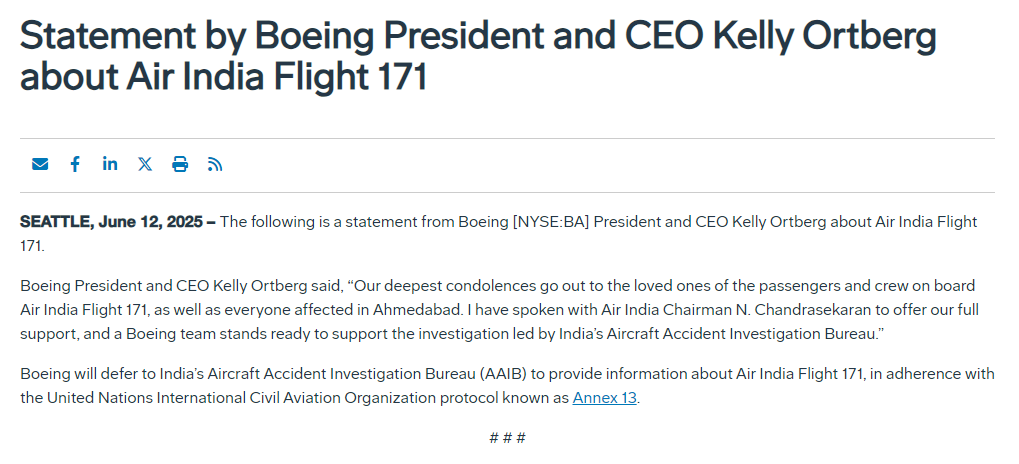 波音公司官网发布“波音总裁兼首席执行官凯利·奥特伯格关于印度航空171航班的声明”。