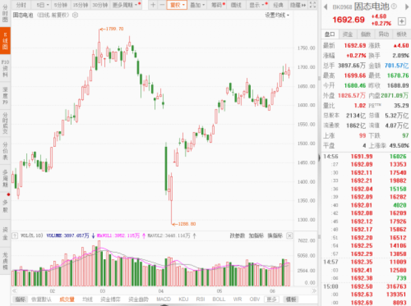 近日,固态电池概念板块持续活跃,主营业务涉及固态电池领域的上市公司科恒股份(300340.SZ)股价连续大涨,最大涨幅翻倍;此外,金银河(300619.SZ)、德新科技(603032.SH)等相关上市公司的股价近日也出现了大幅上涨。