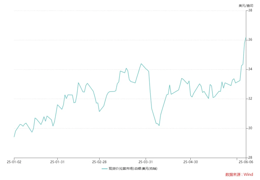 今年以来,在全球经济和政治不确定性日益加剧的背景下,包括白银在内的贵金属价格受到避险资金的支撑。从年初至今,现货白银已累计涨逾23%。6月6日,现货白银价格最高报每盎司36.19美元,站上自2012年以来的新高。