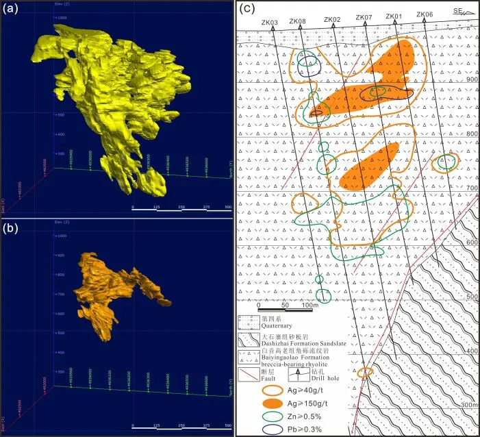 布敦乌拉矿体模型(a)、富矿块模型(b)以及典型地质剖面图(c)