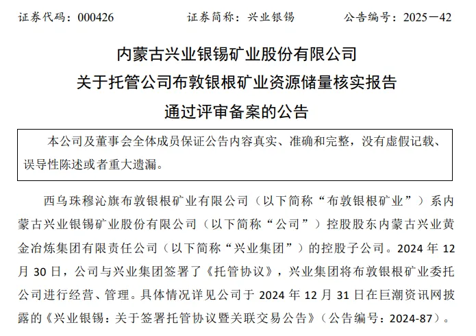目前,本次资源储量核实报告已通过国家矿产资源储量评审机构评审备案(备案文号:锡自然资源储备字〔2025〕006号)。