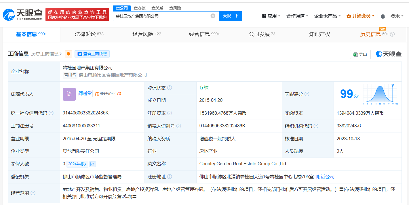 天眼风险信息显示,碧桂园地产集团有限公司现存40余条被执行人信息,被执行总金额超52亿元。此外,该公司还存在多条限制消费令、终本案件及股权冻结信息。