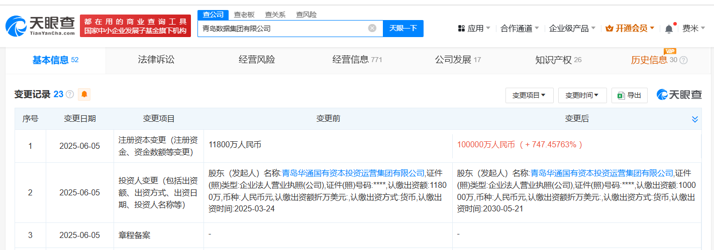 天眼查App显示,近日,青岛数据集团有限公司发生工商变更,注册资本由1.18亿人民币增至10亿人民币,增幅约747%。