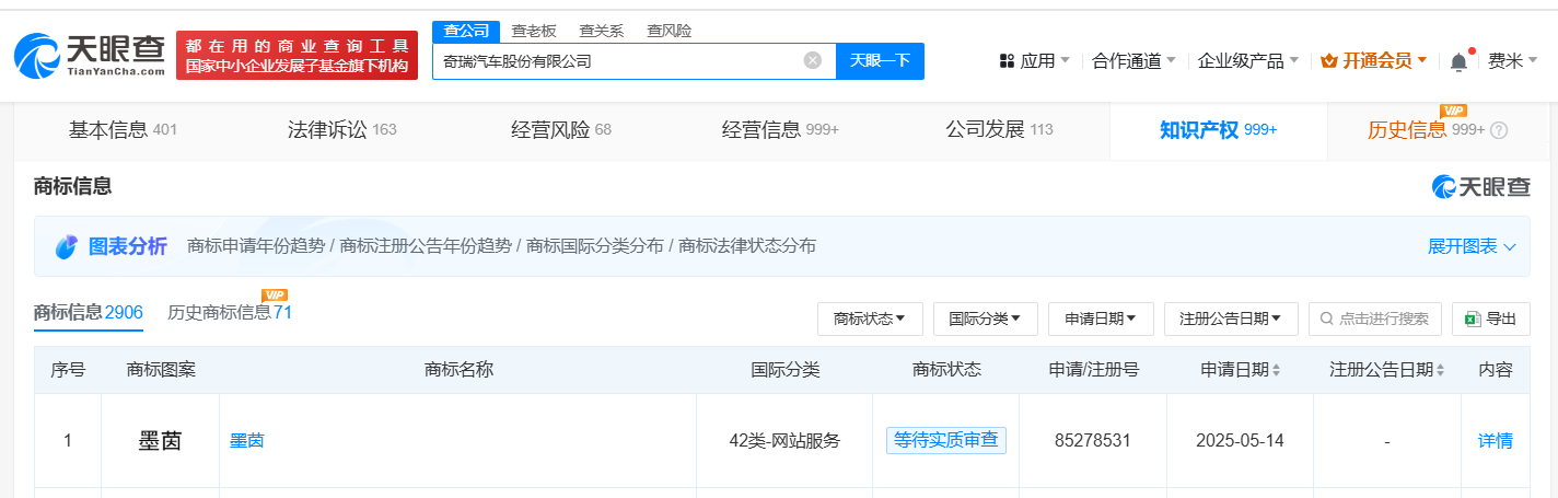 天眼查财产线索信息显示,近日,奇瑞汽车股份有限公司申请注册“墨茵”商标,国际分类为网站服务,当前商标状态为等待实质审查。