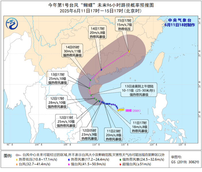 中央气象台6月11日18时发布台风黄色预警:今年第1号台风“蝴蝶”(热带风暴级)的中心今天(11日)下午5点位于海南三亚东偏南方向大约300公里的海面上,就是北纬16.8度、东经111.9度,中心附近最大风力8级(18米/秒),中心最低气压为993百帕,七级风圈半径100-260公里。