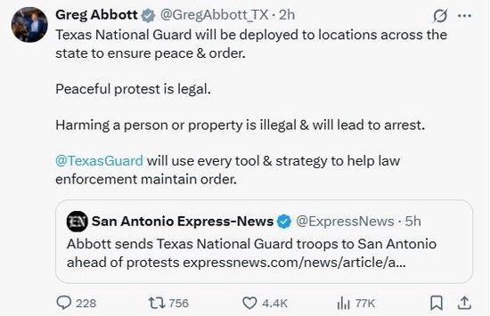 “和平抗议是合法行为,但伤害他人和损坏财产不合法,(肇事者)会被逮捕。”共和党籍的阿博特在社交媒体上说,“得州国民警卫队将用一切方式方法,帮助执法机构维持秩序。”
