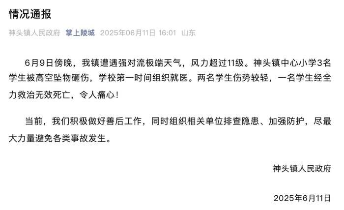 6月11日,山东德州神头镇人民政府通报,6月9日傍晚,神头镇遭遇强对流极端天气,风力超过11级。神头镇中心小学3名学生被高空坠物砸伤,学校第一时间组织就医。两名学生伤势较轻,一名学生经全力救治无效死亡。