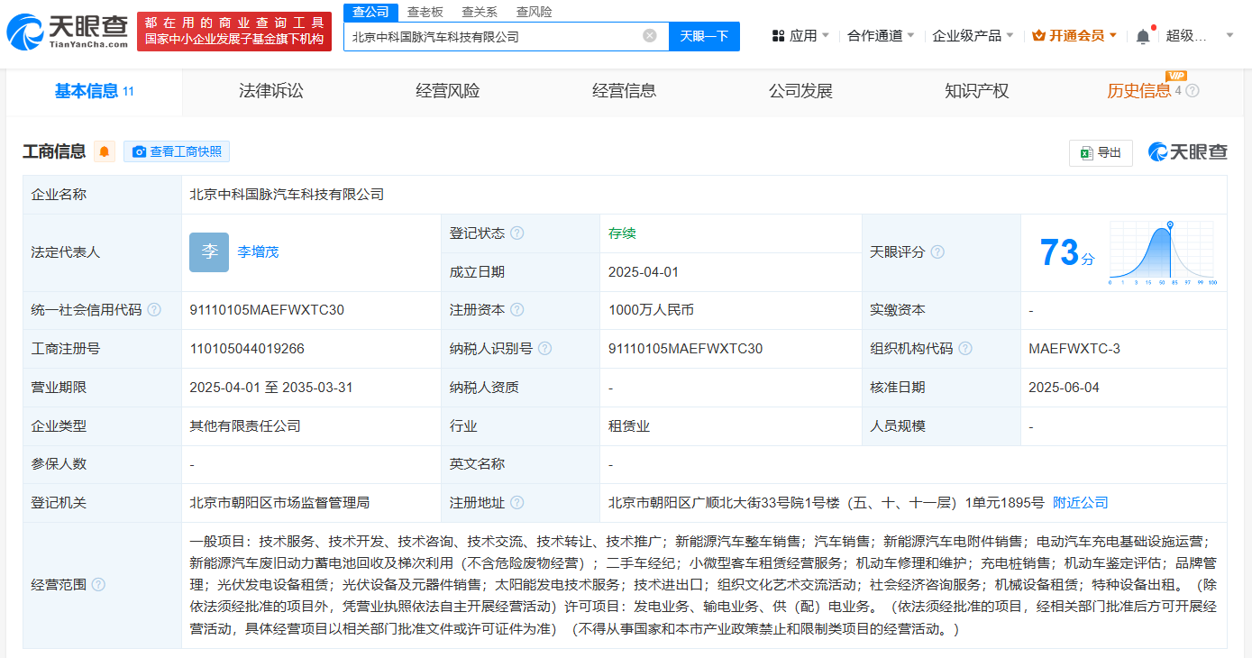 北京中科国脉汽车科技有限公司成立于今年4月,法定代表人为李增茂,注册资本1000万人民币,经营范围包括新能源汽车整车销售、电动汽车充电基础设施运营、新能源汽车废旧动力蓄电池回收及梯次利用等,现由中科国脉智能科技(北京)有限公司、奇瑞商用车(安徽)有限公司共同持股。