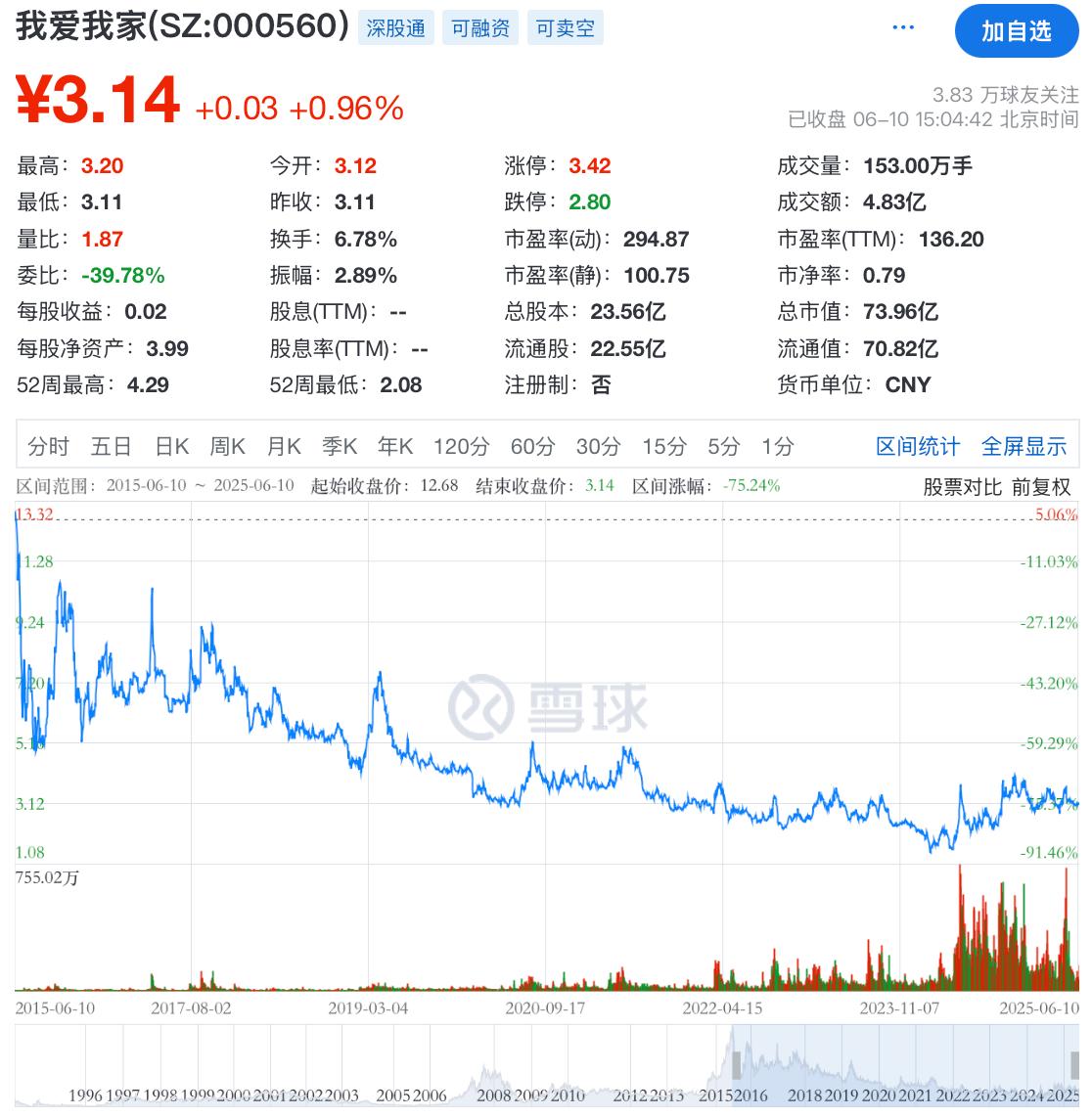 我爱我家最新股价报3.14元/股,拉长时间看,10年时间,公司股价已跌去75%。
