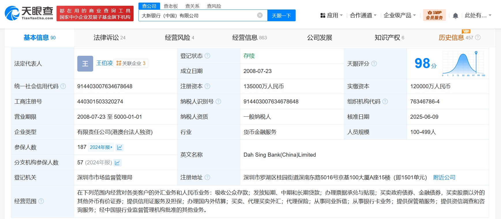 天眼查App显示,近日,大新银行(中国)有限公司发生工商变更,注册资本由12亿人民币增至13.5亿人民币,增幅12.5%。