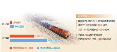 目前,中欧班列去、回程开行基本均衡,综合重箱率基本稳定在100%。中欧班列年运输货值由2016年的80亿美元增长到2024年的664亿美元,累计货值超4500亿美元。