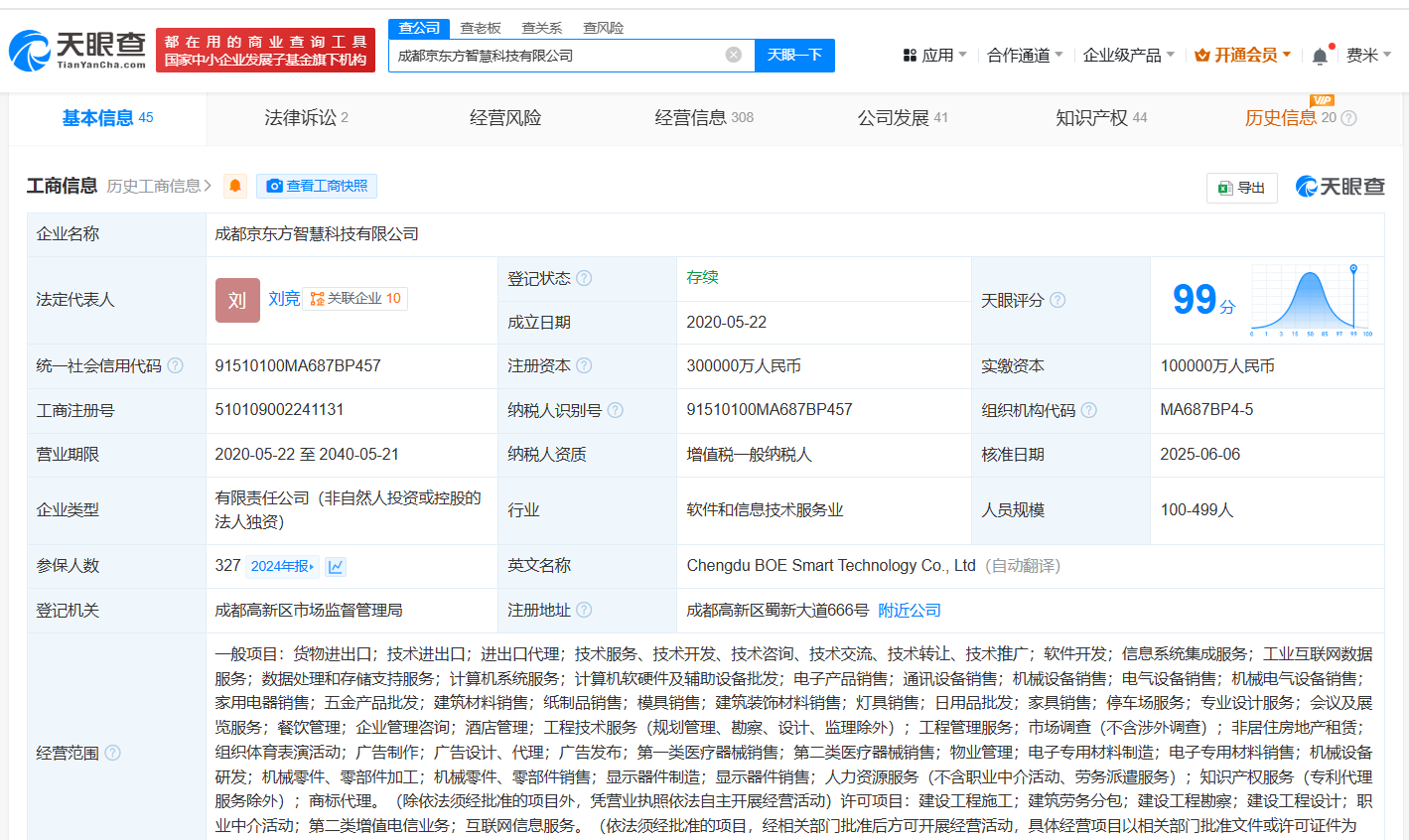 该公司成立于2020年5月,法定代表人为刘竞,经营范围包括信息系统集成服务、工业互联网数据服务、数据处理和存储支持服务等,由京东方A(000725)旗下京东方智慧科技有限公司全资持股。