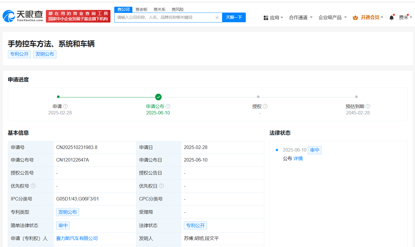 天眼查财产线索信息显示,近日,赛力斯汽车有限公司申请的“手势控车方法、系统和车辆”专利公布。