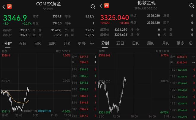6月10日,现货黄金价格一度向下触及3310美元/盎司,后跌幅有所收窄,截至发稿,报3325.04美元/盎司;COMEX黄金也同步下跌,截至发稿,跌超0.24%,报3346.9美元/盎司。